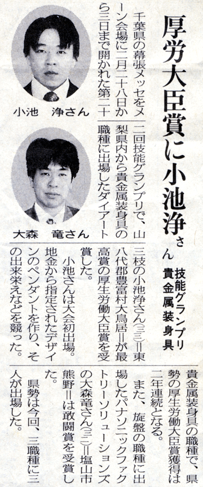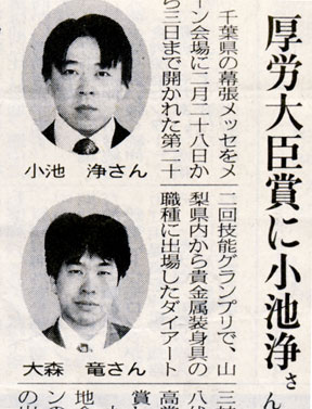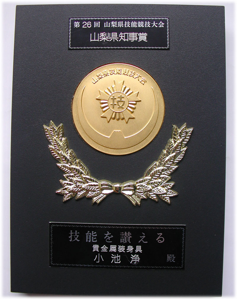 山梨県主催の技能祭りの貴金属装身具製作部門 1位 (山梨県知事賞受賞)